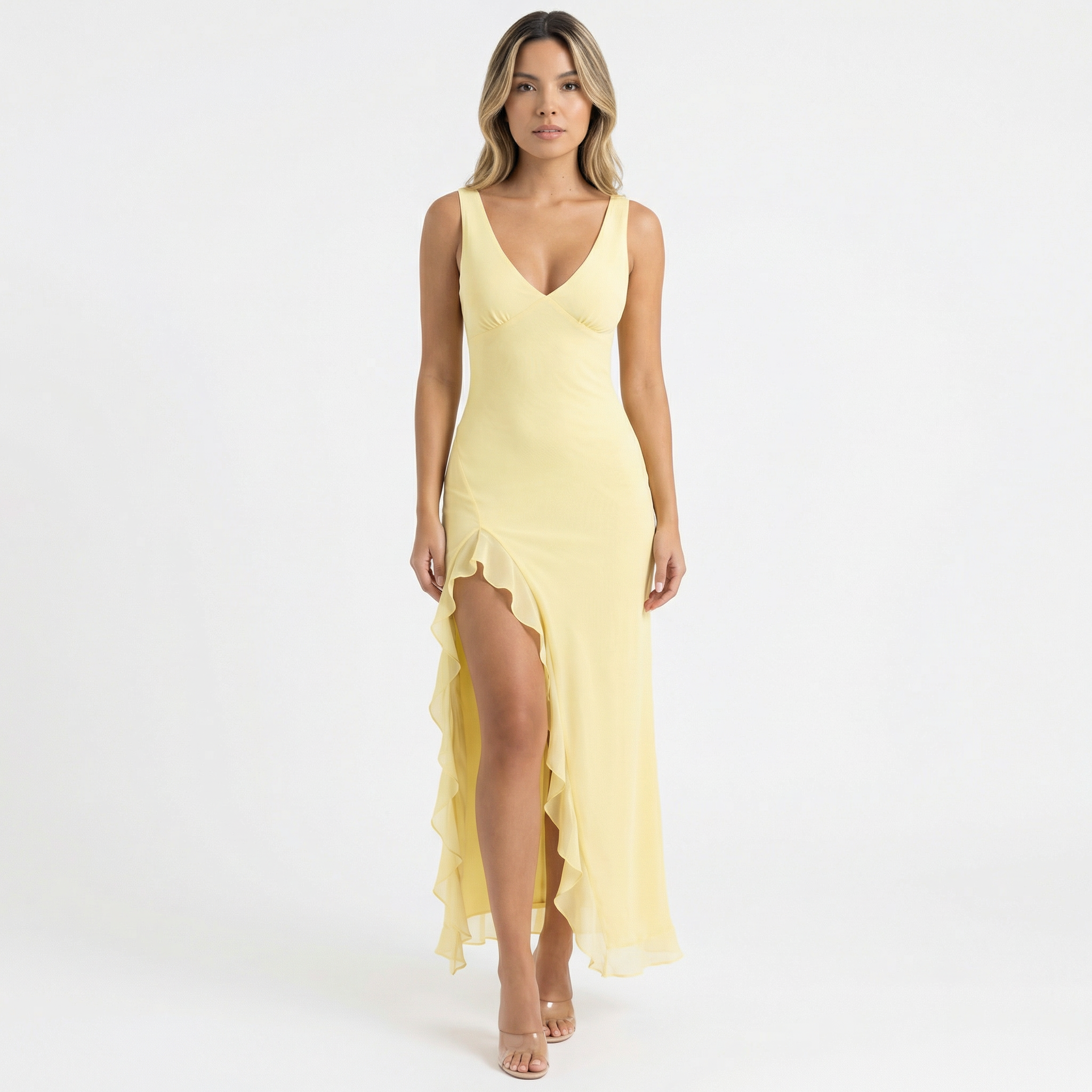 - Fente haute qui définit la silhouette avec une structure élégante.