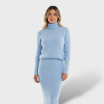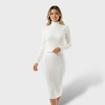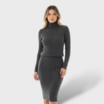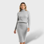 Cet ensemble en tricot allie style et confort pour la mi-saison. Le pull col montant et la jupe ajustée créent une silhouette féminine adaptée à diverses occasions, allant du bureau aux sorties décontractées.